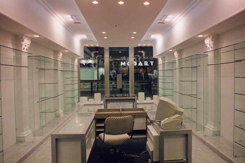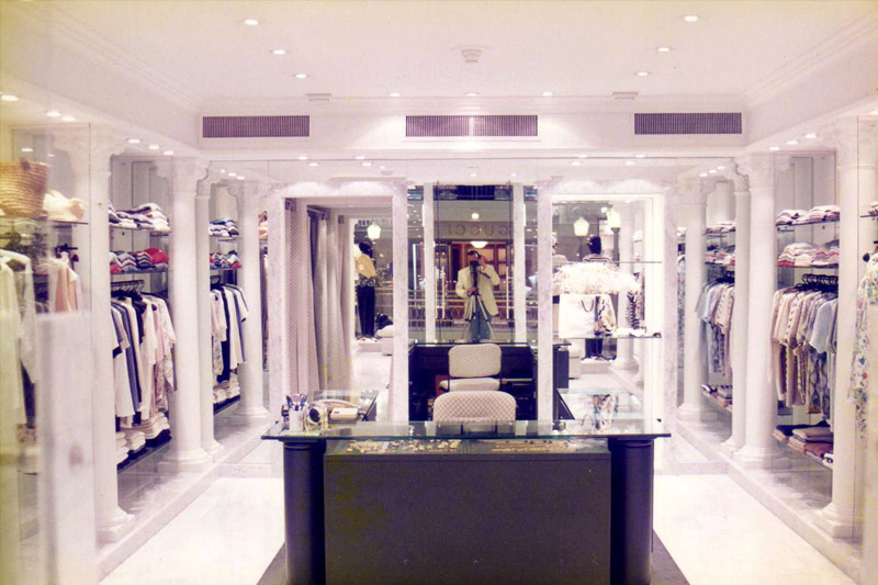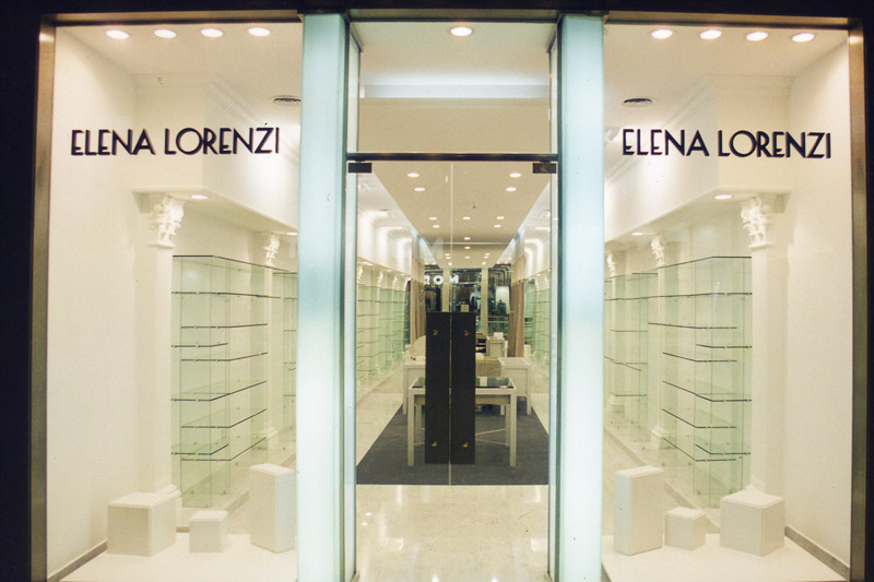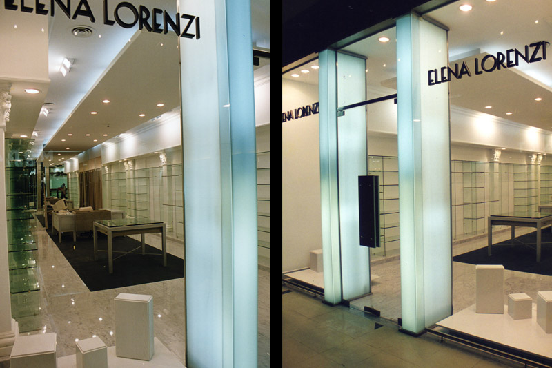 La cadena de locales comerciales para la empresa de tejidos Elena Lorenzi tuvo como elemento de lenguaje arquitectónico representativo en todas sus versiones el isotipo de la empresa: el capitel corintio. Este elemento de orden clásico se utilizó en todos los locales de manera diversa y siempre presente: en algunos de ellos se utilizó la columna, en otros la pilastra, en otros el capitel y donde todo este conjunto de piezas estructurales y decorativas de la arquitectura antigua fue dialogando a lo largo del proyecto de cada local con interiores blancos, mármoles estatuarios, cristales y acero inoxidable. Se desarrolló para la imagen de los locales un sistema de estanterías de vidrio templado que constituyó el primer precedente de arquitectura comercial para los muebles de vidrio hoy llamados de unión laser.